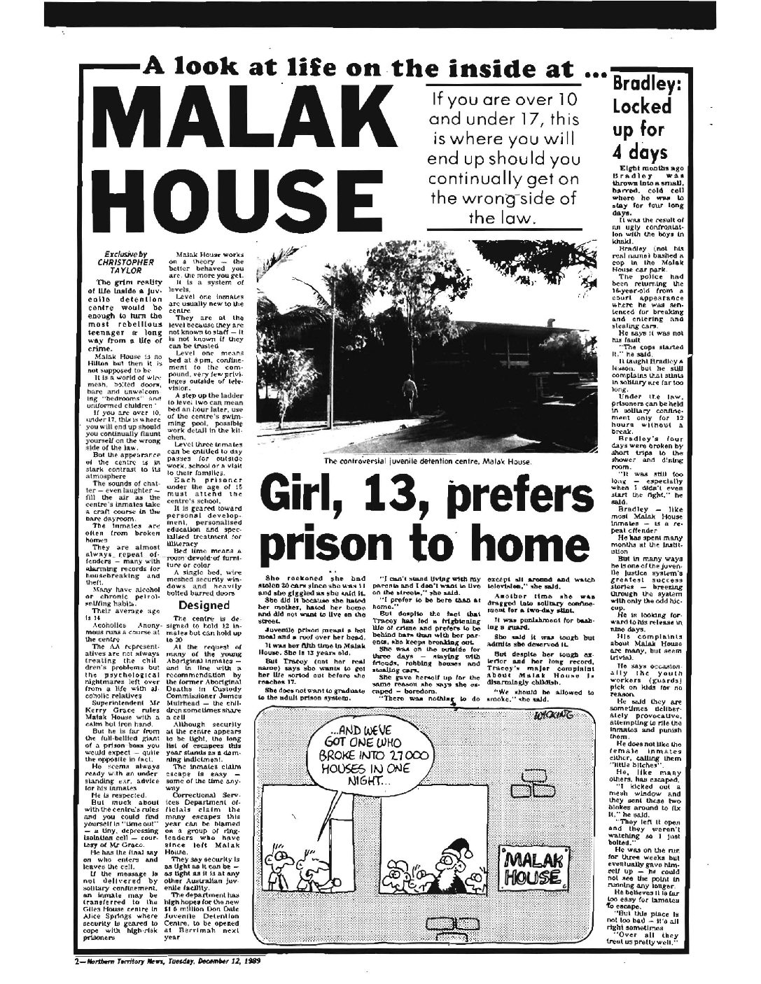 Description: This document contains digital copies of articles published in the Northern Territory News and Sunday Territorian in December 1989, relating to Malak House.