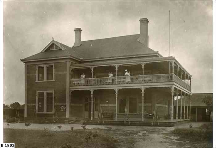 Description: The library description states: Nurses, with their small charges, pose for the photographer on the balcony of Mareeba Hospital, Woodville Park, in October 1921. Previously, it had been a convalescent hospital for soldiers, but in August, 1917, it formally became the Mareeba Babies Hospital. Used as a part-time training hospital for nurses, it was extended during the 1920s to accommodate up to 70 babies, including some rooms for mothers.