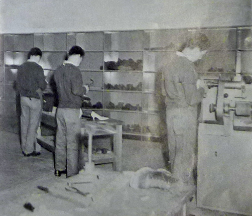 Description: This is a copy of a picture of young men working in the boot and upholstery workshop at the McNally Training Centre that appeared in the 1969 Annual Report of the Department of Social Welfare.
