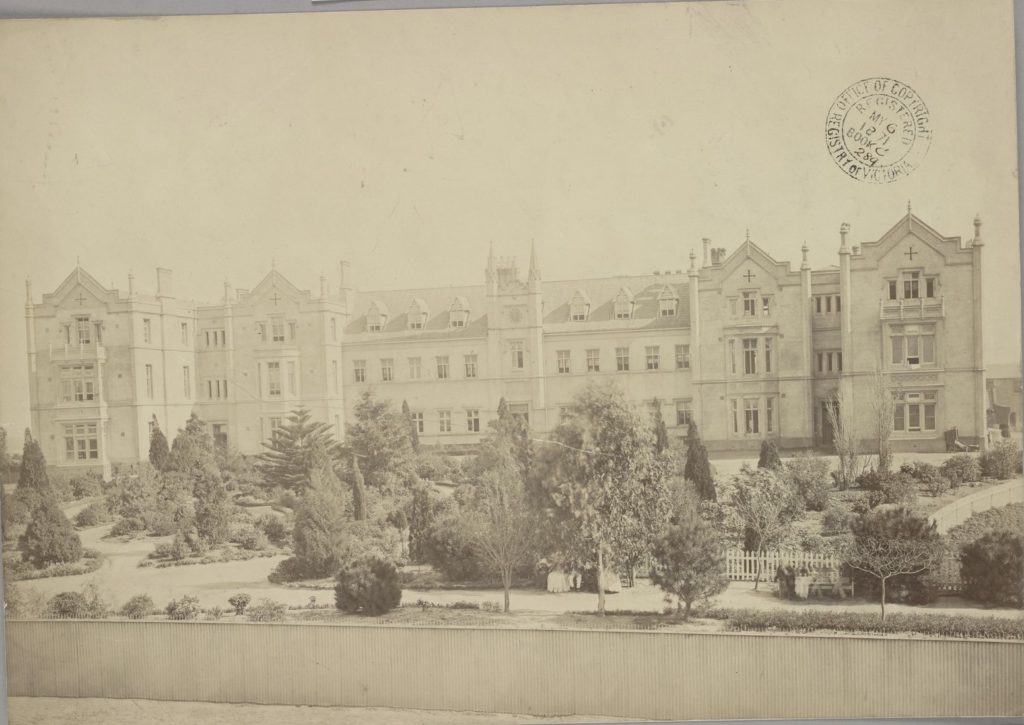 Description: Photographic print of the Benevolent Asylum, North Melbourne. Shows 3-storey buildings with trees and shrubs in foreground. In centre of buildings is clock face between 2 small spires. People are seated on 2 benches and partially obscured by trees l.r.