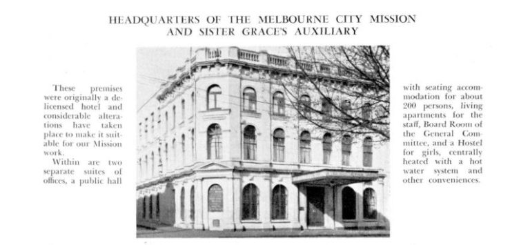 In 1949, Melbourne City Mission described itself as ‘an interdenominational institution registered with the Charities Board of Victoria operating amongst the poor, outside the Churches, supported by voluntary contributions’.