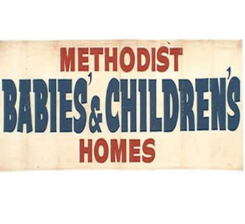 Description: This is an image of a banner made of white stiffened linen with painted red and blue lettering ‘Methodist Babies’ & Children’s Home’. Used around 1929. Holes in top corners suggest it was pinned, perhaps to a table at a street stall; there is no evidence to show that it was ever hung or supported by all four corners.