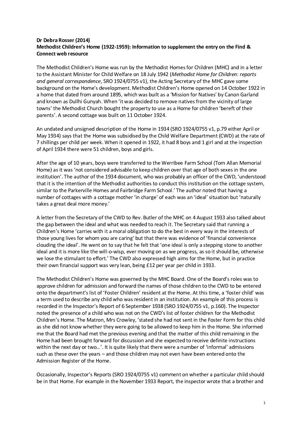 Description: This is a PDF document containing research by Dr Debra Rosser into the history of Methodist Children’s Home. It draws on archival sources (including Inspectors’ Reports at the State Records Office – Series 3172 – Files – Child Welfare; Cons: 1031 Item: 1924/0755 v1) to provide detailed historical information about the Home, including: buildings, facilities and grounds; recordkeeping relating to punishments and discipline; special activities, excursions and holidays; food offered to the residents over various years, and; outbreaks of illnesses at the Home.