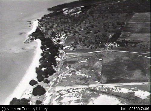 Description: The description reads: Aerial view, Methodist Mission, Milingimbi. Houses are under trees on beach.