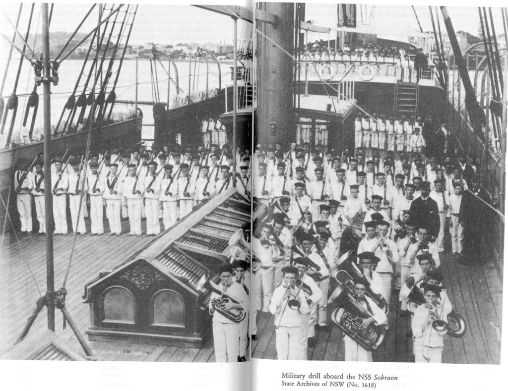 Description: This photograph shows boys in formation on the deck of the NSS Sobraon. The boys’ brass band is standing at the front, and the boys standing behind are all holding rifles. All boys are wearing white naval-style uniforms.