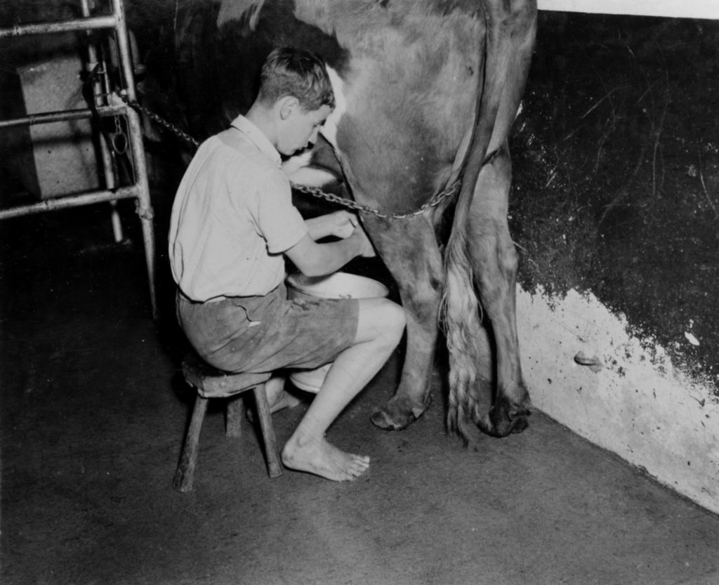 Description: This is a digitised copy of a photographic print and is part of the group of three images called ‘Dairy cows and milking at Fairbridge [picture]’ held at the State Library of Western Australia. The image shows a boy milking a cow at Fairbridge Farm School.