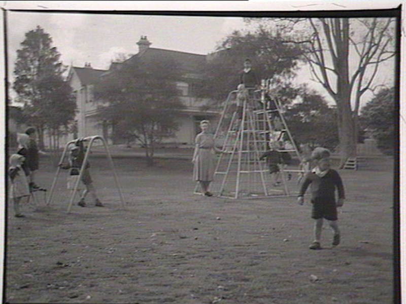 Description: This image shows small children playing outside on play equipment at Montrose Infants’ Home.