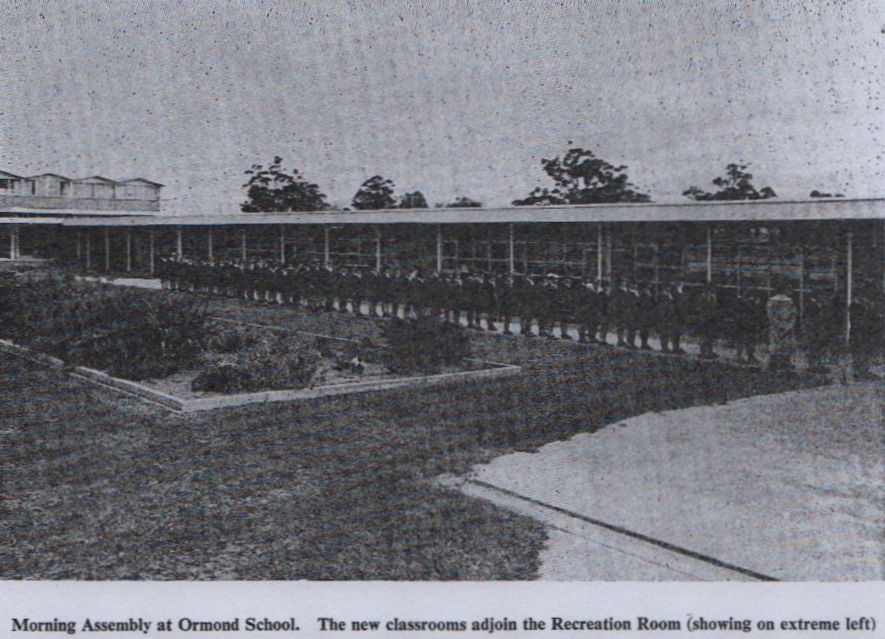Morning assembly at Ormond School. The new classrooms adjoin the Recreation Room (showing on extreme left)