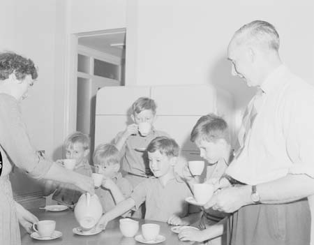 Description: [Caption taken from the National Archives of Australia recordsearch] Immigration – Child migration schemes – The Fairbridge Society has converted “Tresca”, Exeter, Tasmaina, into a home for children from Britain. The new home is for children from broken homes, parentless children, or children with only one parent unable to care for them. Morning coffee for everyone at Tresca. Harry Richmond, the Warden, is to the right.