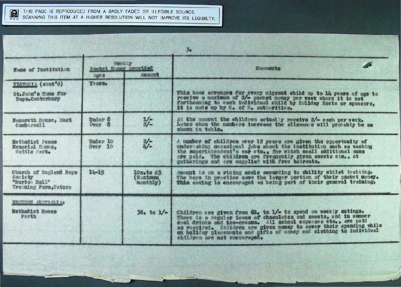 Description: This is an excerpt from the digital copy of the John Moss Report on Child Migration – Implementation of Recommendations from the National Archives of Australia website. It is a brief summary of the types and amount of pocket money which the Australian institutions reportedly gave to child migrants from Britain. These institutions were the Anglican Homes (Swan Homes), the Methodist Home for Children, Fairbridge Farm School and the Catholic Episcopal Migration and Welfare Association.