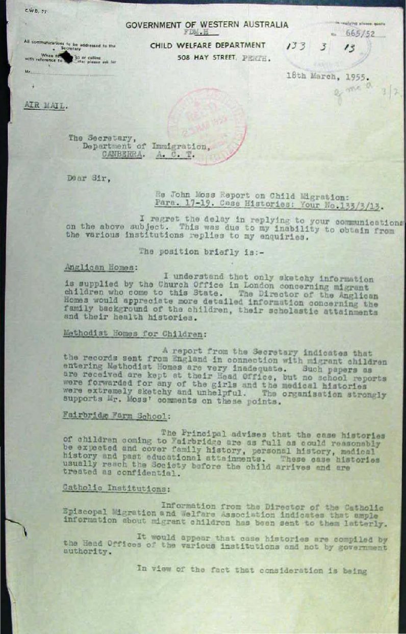 Description: This is an excerpt from the digital copy of the John Moss Report on Child Migration – Implementation of Recommendations from the National Archives of Australia website. It is a letter from the Child Welfare Department in Western Australia. The letter gives a brief summary of the types of ‘case history’ information that was sent to the institutions receiving child migrants from Britain after World War Two. These institutions were the Anglican Homes (Swan Homes), the Methodist Home for Children, Fairbridge Farm School and the Catholic Episcopal Migration and Welfare Association.