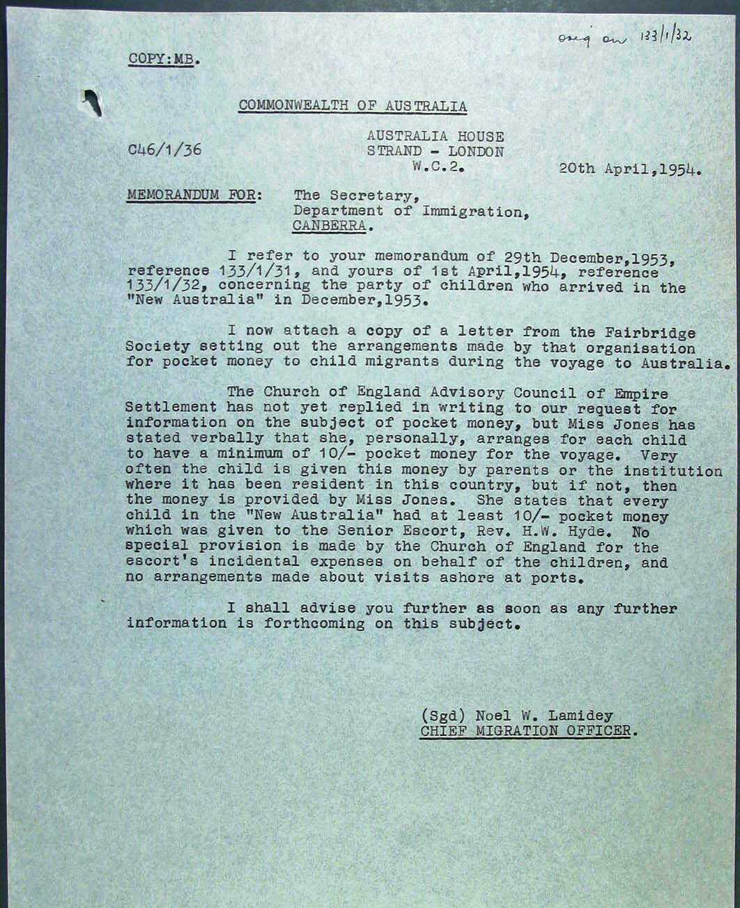 Description: This is an excerpt from the digital copy of the John Moss Report on Child Migration – Implementation of Recommendations from the National Archives of Australia website. It gives information about the pocket money for their voyage, supplied to child migrants coming from Britain to Swan Homes.