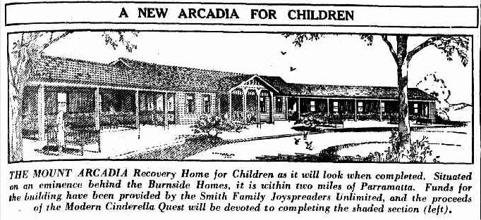 Mount Arcadia Children’s Home in Parramatta North that was established by the Smith Family in 1933. It was a convalescent home for children suffering from juvenile rheumatism and other illnesses. Most children stayed at Mount Arcadia for around 5 months before returning home. The hospital was rebuilt in the mid 1950s, and in 1958, the property was sold to Tara Anglican School for Girls.