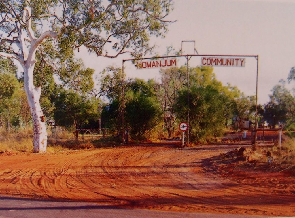 Description: ‘Mowanjum community gate 1970s’ is an image published in Mowanjum: 50 years community history (p.115). The caption reads, ‘Mowanjum front gate, 1973-74’. It shows a tall metal gate with a left-hand and right-hand entrance/exit over a red sandy road, with ‘Mowanjum Community’ written in red letters on white signage. A few buildings are just visible through the trees behind the gate.