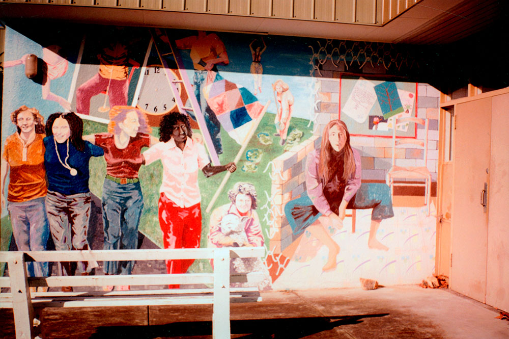 Description: This is a copy of an image of a ‘public images’ mural in the Winlaton compound. According to the ‘Finding Records’ website, the mural was painted by staff and young women in 1983. The project was funded by the Victorian Ministry for the Arts.