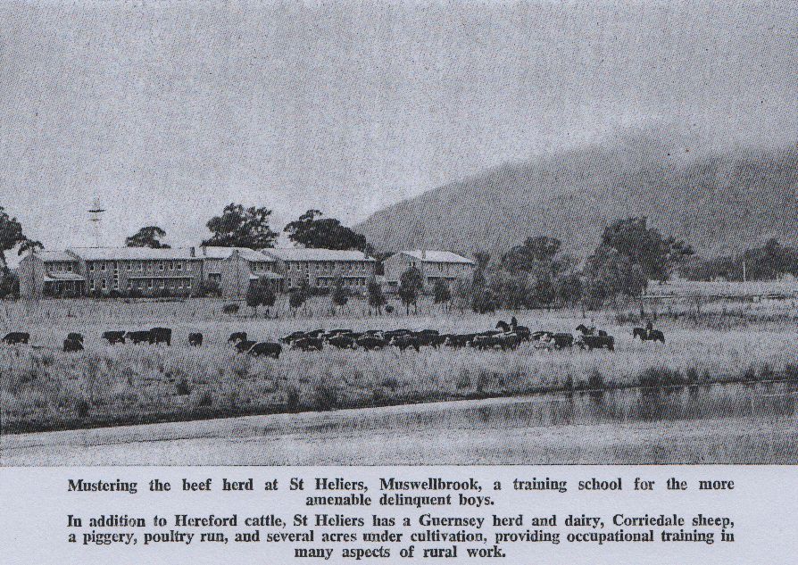 Description: This is a scan of an image that appeared in the Child Welfare Department Annual Report of 1966. The rest of the caption reads ‘In addition to Hereford cattle, St Heliers has a Guernsey herd and dairy, Corriedale sheep, a piggery, poultry run, and several acres under cultivation, providing occupational training in many aspects of rural work.’