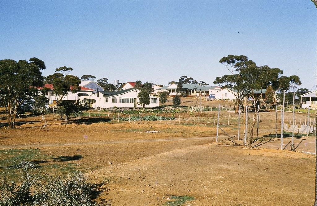 Description: Norseman Mission, view’ is a digital copy of an image held by Global Mission Partners in the Churches of Christ Federal Aborigines Mission Board Photographs collection. As described by historian Deslee Moyle, the image dates from the 1960s and was taken from the schoolhouse. In the foreground is superintendent’s house; the red roofed dining room is to the left; and the building with the silver roof behind the dining room is the workshop, which held the lighting plant and other maintenance equipment. A number of the Homes for children are visible, and the tennis court is on the far right of the picture.