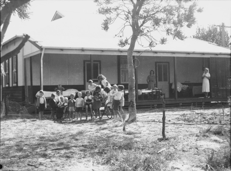 Description: This is a photo of children outside the Nursery building at Sister Kate’s Children’s Cottage Home, Queens Park. A group of 17 toddlers and young children can be seen standing in front of a large cottage. Two women, one dressed in what appears to be a white nurses uniform, stand behind the children on the cottage verandah.