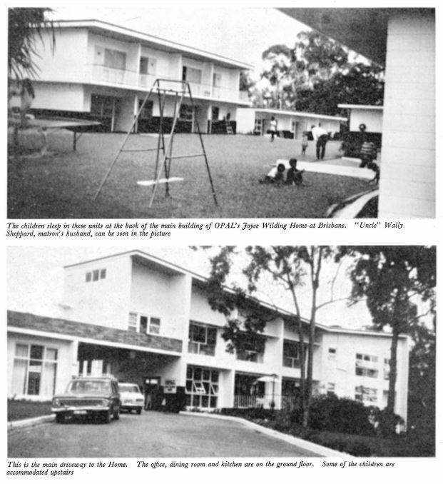OPAL Joyce Wilding Home was operated by the One People of Australia League (OPAL). In 1970, OPAL purchased the home (on the Pacific Highway in Upper Mount Gravatt, later known as Eight Mile Plains) with funding from Commonwealth and Queensland governments in 1970, and the Home was licensed on 7 August 1970. Its licence was cancelled on 11 February 1977, and it became an aged care facility. By late 1978, OPAL House, Eight Mile Plains had returned to housing mothers and children, whilst also housing pensioners. The Joyce Wilding Hostel continues to provide transitional accommodation in 2018.