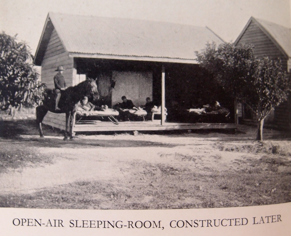 Description: ‘Open-air sleeping-room constructed later, [Fairbridge, after 1913?]’ is a photograph showing a three-walled building used as sleeping quarters at Fairbridge, Pinjarra, presumably before dormitories had been constructed. In the image several boys can be seen lying on cots within the building, while a man sits on horseback outside.