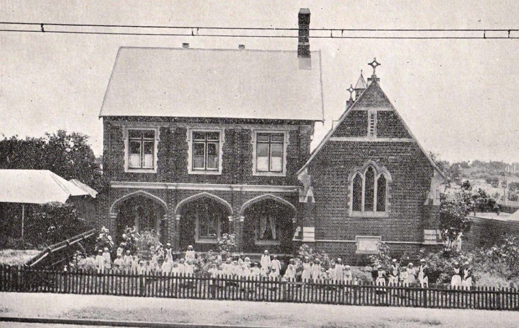 This image shows a two-storey brick house directly connected to what looks to be a church. Several dozen children in white dresses and staff wearing white aprons are standing in the garden in front of the buildings.