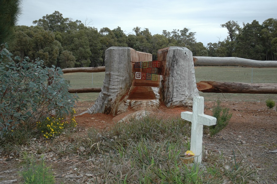 Description: This is a digital copy of a photograph held in the Parkerville Children and Youth Care (Inc) archives. It shows part of the children’s gravesite, including a decorative sculpture of children’s building blocks.