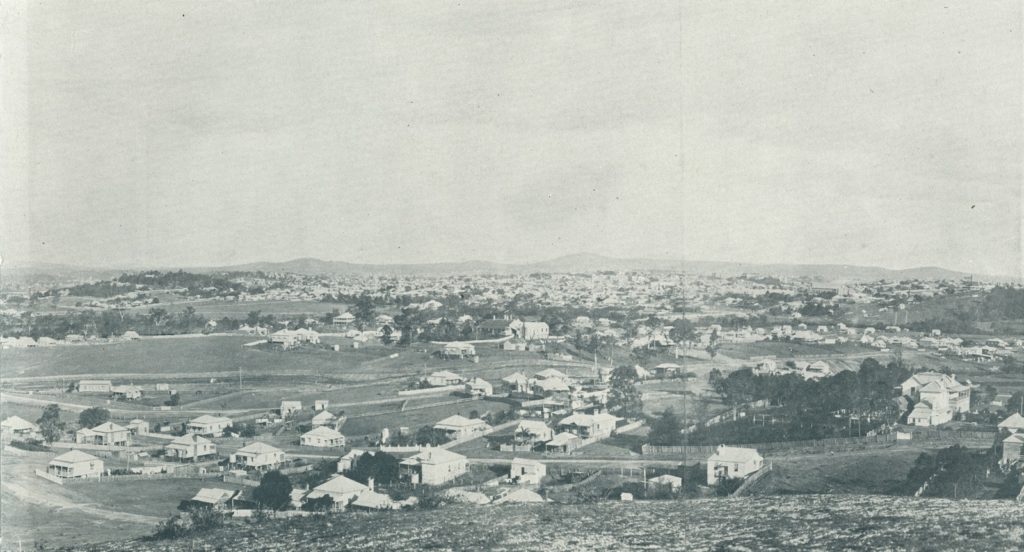 Description: The library catalogue includes this description: Eildon Hill is situated in the suburb of Windsor near Wilson in the north of Brisbane. In this photograph one can see Bowen Hills the suburb and out towards the city of Brisbane in the centre of the image. The foreground is dotted with houses and farmlets. The large homestead on the right is Monte Video, which was later named Boothville.