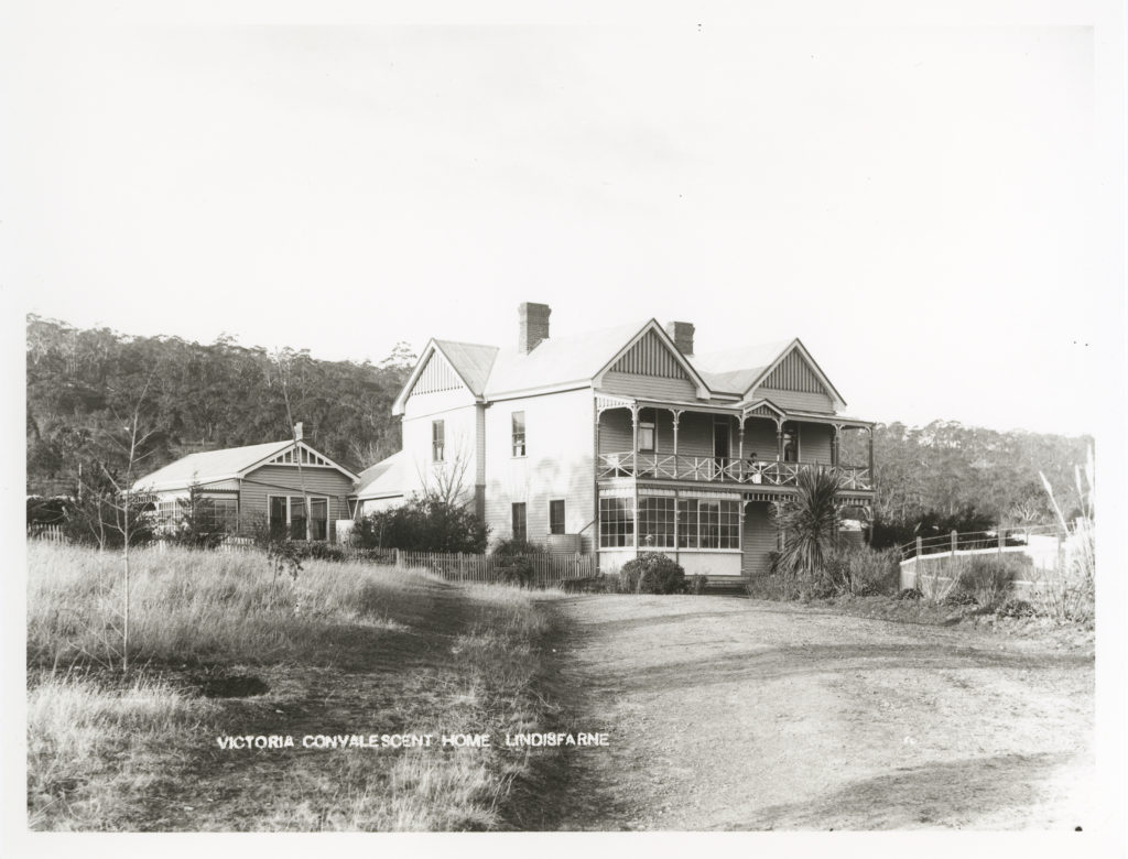 Description: This is an image of the Victoria Convalescent Home at Lindisfarne, Tasmania. It shows a large two-storey house with outbuildings surrounded by gardens, with bushland in the background. A woman can be seen on the upstairs verandah.