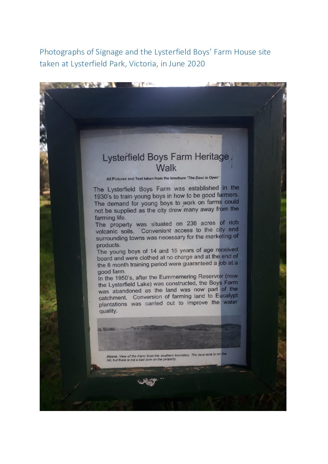 Description: This document contains photographs of the site of the Lysterfield Boys’ Farm, also known as the Church of England Boys’ Society Training Farm, as well as signage at the site. The photographs of the site show a small section of wall and a domed-top well, which are all that remain of the farm house. The signage at the site consists of exerpts and images from the brochure ‘The Door is Open’, which provide context for the site.