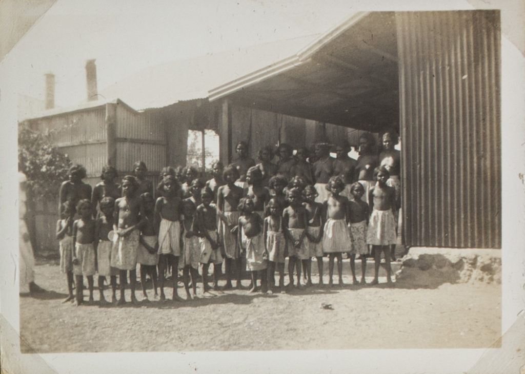 Description: This is a photograph taken at Port Keats Mission in 1949. It shows a group of women and children lined up outside the mission buildings. A caption on the rear of the image reads “The Girls at Port Keats Mission”.