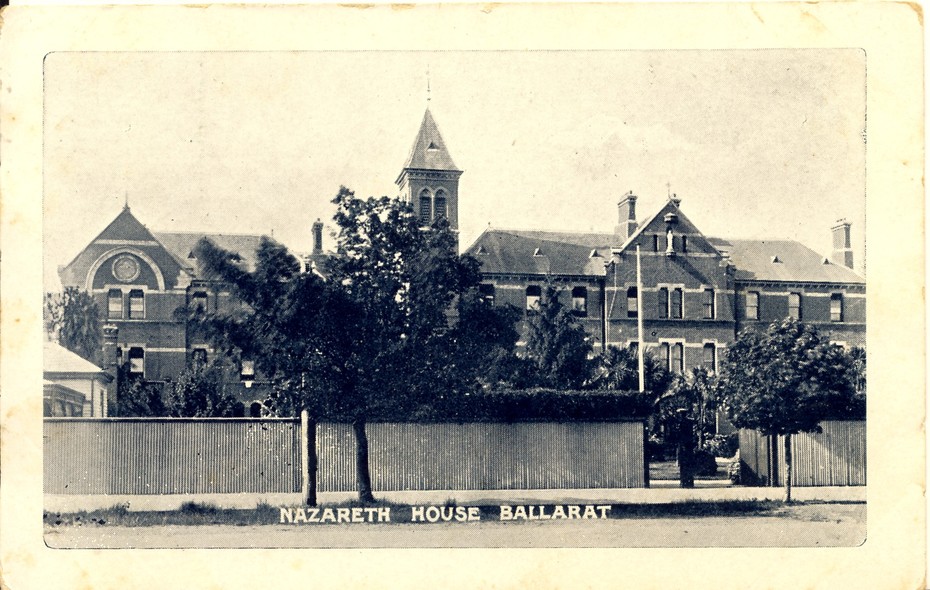 Description: The black and white card shows Nazareth house in Ballarat. A high fence is in the front of the building, a tower is the most prominent point in the middle of the picture and there are two trees in front of the fence nearest the street. The name is in white along the nature strip.