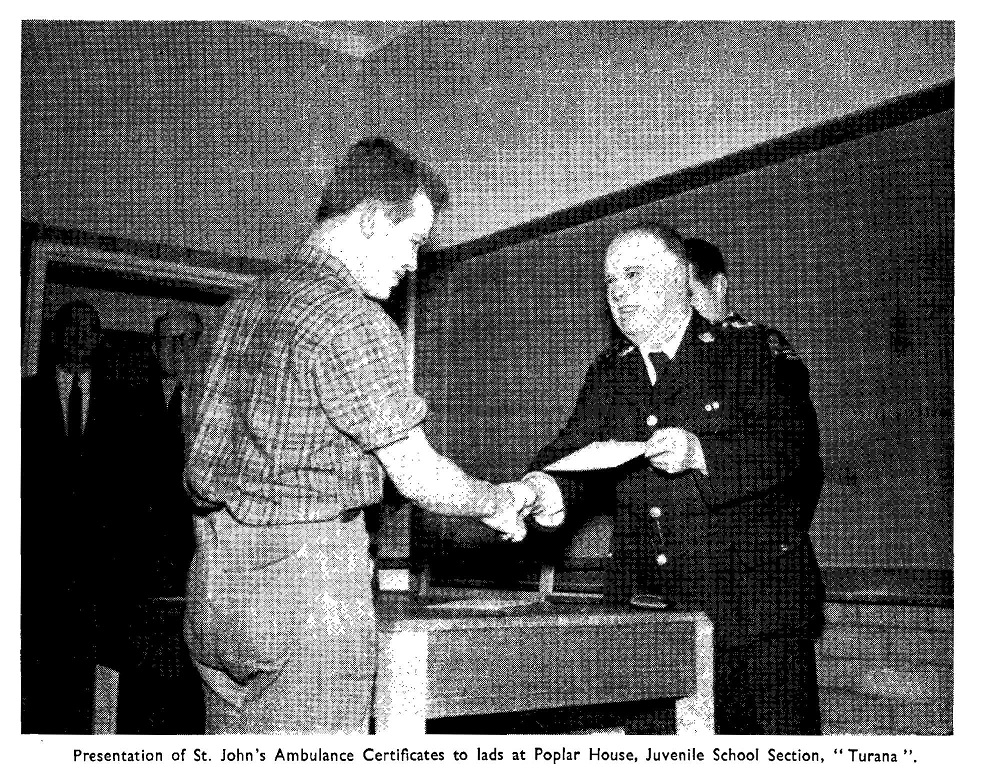 Presentation of St John's Ambulance certificates to lads at Poplar House, Juvenile School Section, "Turana"
