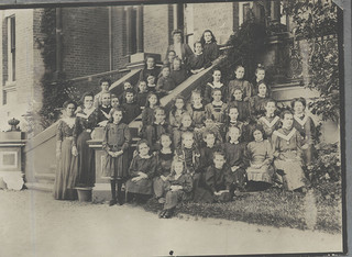 Description: This is a copy of a photograph in the archives of the School for Deaf Girls, Waratah (formerly known as Waratah Deaf and Dumb Institute) at the Rosary Convent, Waratah, NSW, Australia, held by Cultural Collections at the University of Newcastle, Australia. The image shows a group of pupils and teachers sitting outside on the steps of the School for Deaf Girls.