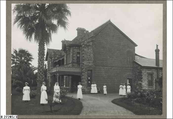 Description: The library description states: A side view of the Queen’s Home, Rose Park, building, with a number of nurses in the surrounding garden.