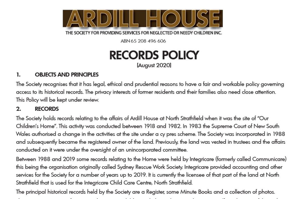 Description: This is a copy of the Records Policy [August 2020] of the Society for Providing Services for Neglected or Needy Children Inc. The Policy guides decisions about access to records of Our Children’s Home (Ardill House).