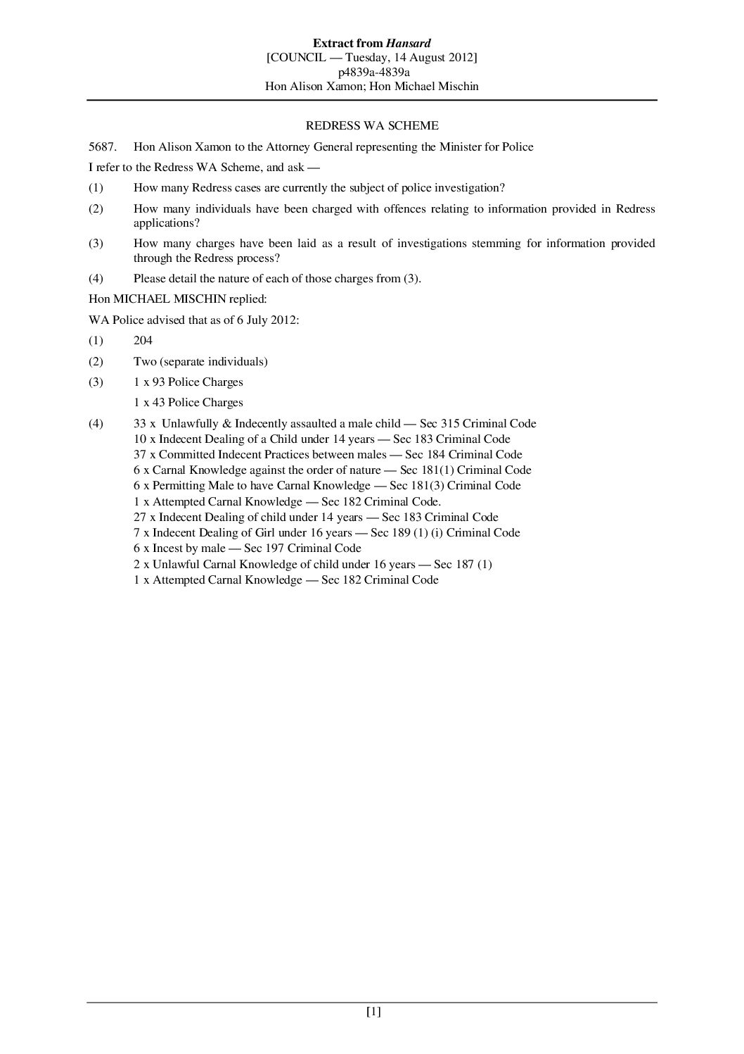 Description: This is an excerpt from the Western Australian Parliament’s Hansard of answers tabled in the Legislative Council by the Attorney General (representing the Minister for Police) to 4 questions put by the Hon. Alison Xamon MLC. The questions relate to police charges and investigations arising from the Redress WA Scheme.