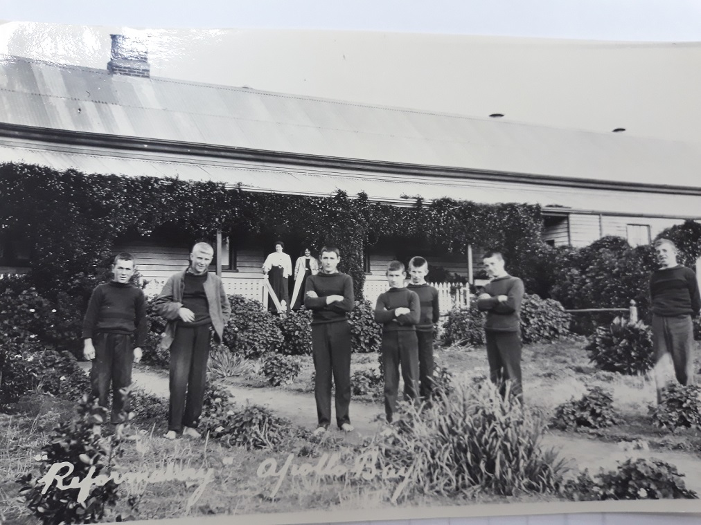 Description: This is an image of the Heathfield Reformatory at Apollo Bay. It shows seven boys standing outside of the reformatory building, and two women on the balcony of the reformatory. The boys appear to be wearing a uniform. The date this photo was taken and the names of the boys, women, and photographer are unknown.