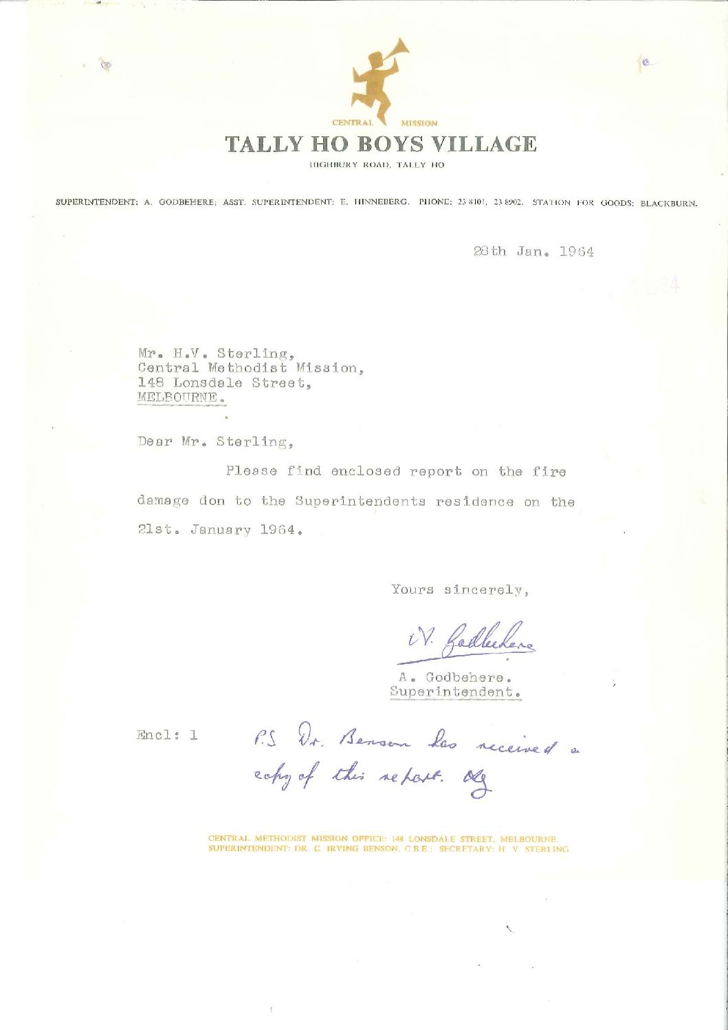 Description: Albert Godbehere, superintendent of the Tally Ho Boys’ Village, wrote the report on the fire, which occurred on Tuesday 21 January 1964.