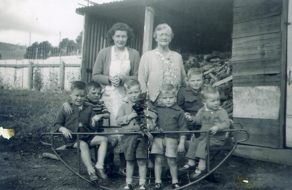 Description: The caption provided states: Robert’s Home Children in Metal Rocker with House Mothers standing behind, Miss Patterson on right, & with the Wood Shed behind, at the Magill Methodist Children’s Home along Penfold Road at MAGILL.