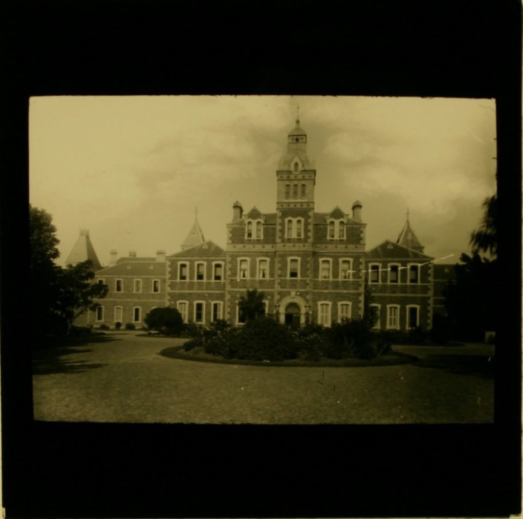 Description: This image of the the Royal Victorian Institute for the Blind shows a large, three-storey bluestone building with a central tower and two-storey wings on either side. In front of the building are gardens, lawns and trees. This image is part of the Royal Victorian Institute for the Blind Collection at Museums Victoria.