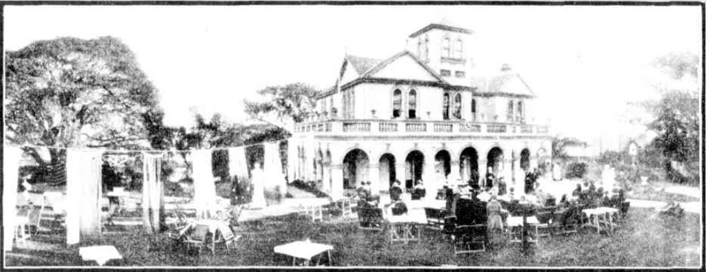 Description: This is an image showing the opening of the Santa Marina hostel for mothers and babies in Waverley (now Bondi), Sydney, in 1919. It was published in the Sydney Mail on 18 June 1919. It shows a large, ornate, two storey house situated in large gardens. At the front of the house is a gathering of approximately 30 people seated facing a speaker, the gardens have been decorated with flags, and tables and chairs have been set up, presumably for the official opening of the home.
