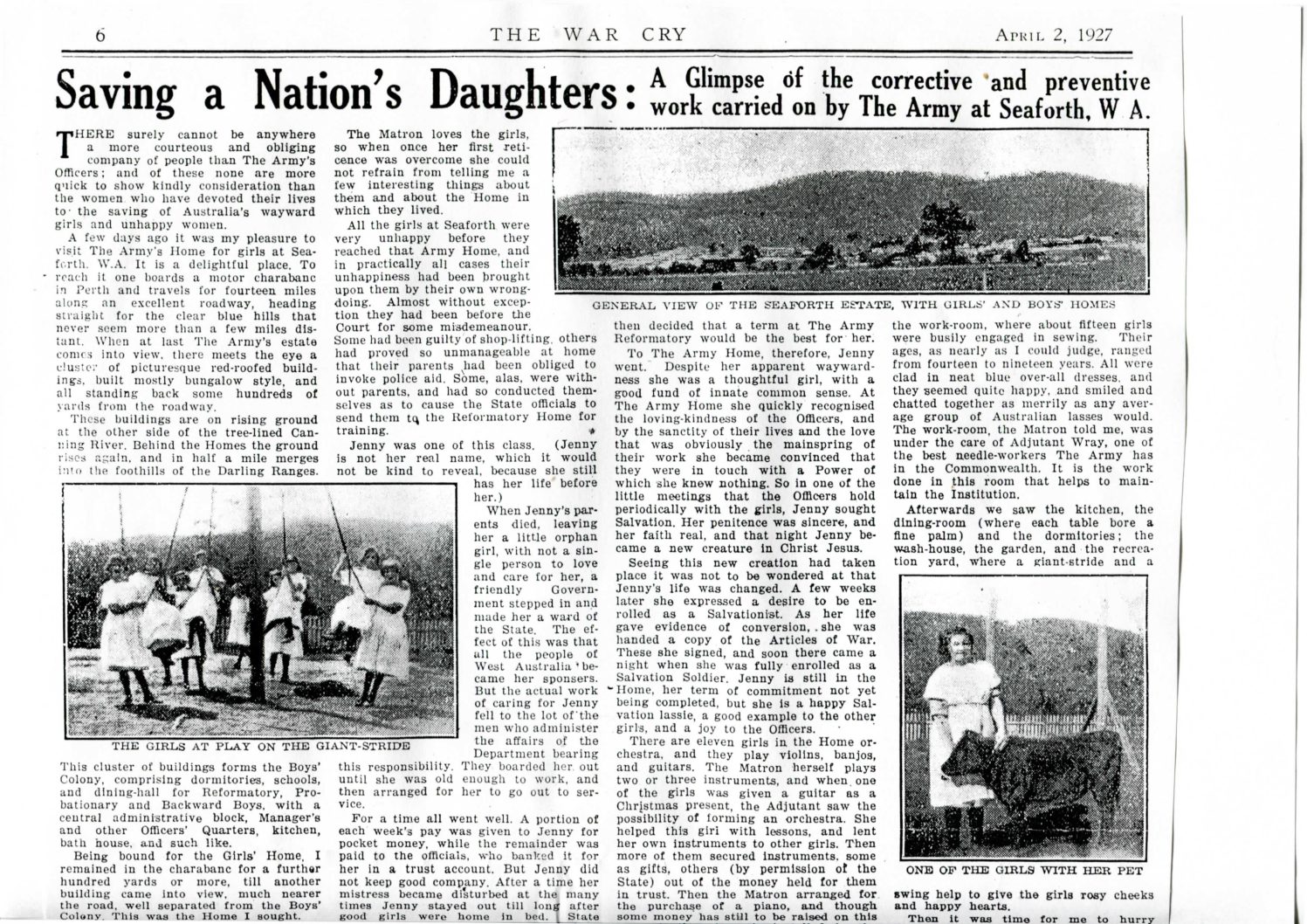 Description: ‘Saving a Nation’s Daughters’ is a digital copy of an item published in the War Cry on 2 April 1927, held in the Seaforth Boys closed social work file at the Salvation Army Heritage Museum WA. It has images of the Seaforth Salvation Army Girls’ Home, including photographs of girls on the ‘giant stride’ and a young woman with a calf. It gives a glowing account of the Home, and describes it as a ‘moral hospital’ where girls, who were there through their own ‘wrongdoing’, could turn their lives around through Christian principles.