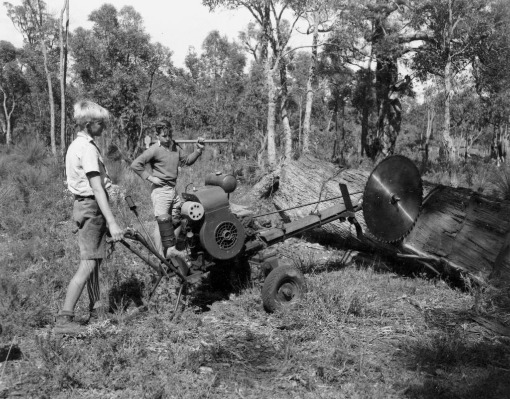 Description: This is a digitised copy of a photographic print and is part of the group of five images titled ‘Boys at work on Fairbridge Farm [picture]’ held at the State Library of Western Australia. The image shows two boys using machinary to saw a large log.