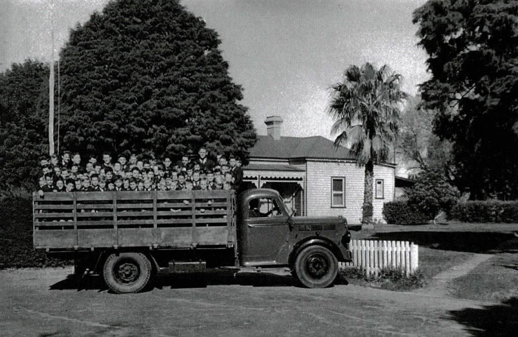 Description: ‘Seaforth Boy’s Home circa 1948’ is adigital copy of an image mounted on a card titled, ‘Young Australians’, held in the Seaforth photos file at the Salvation Army Heritage Museum WA. A typed caption reads in part, ‘Seaforth Boy’s Home – circa 1948 I counted 73 boys + driver.’