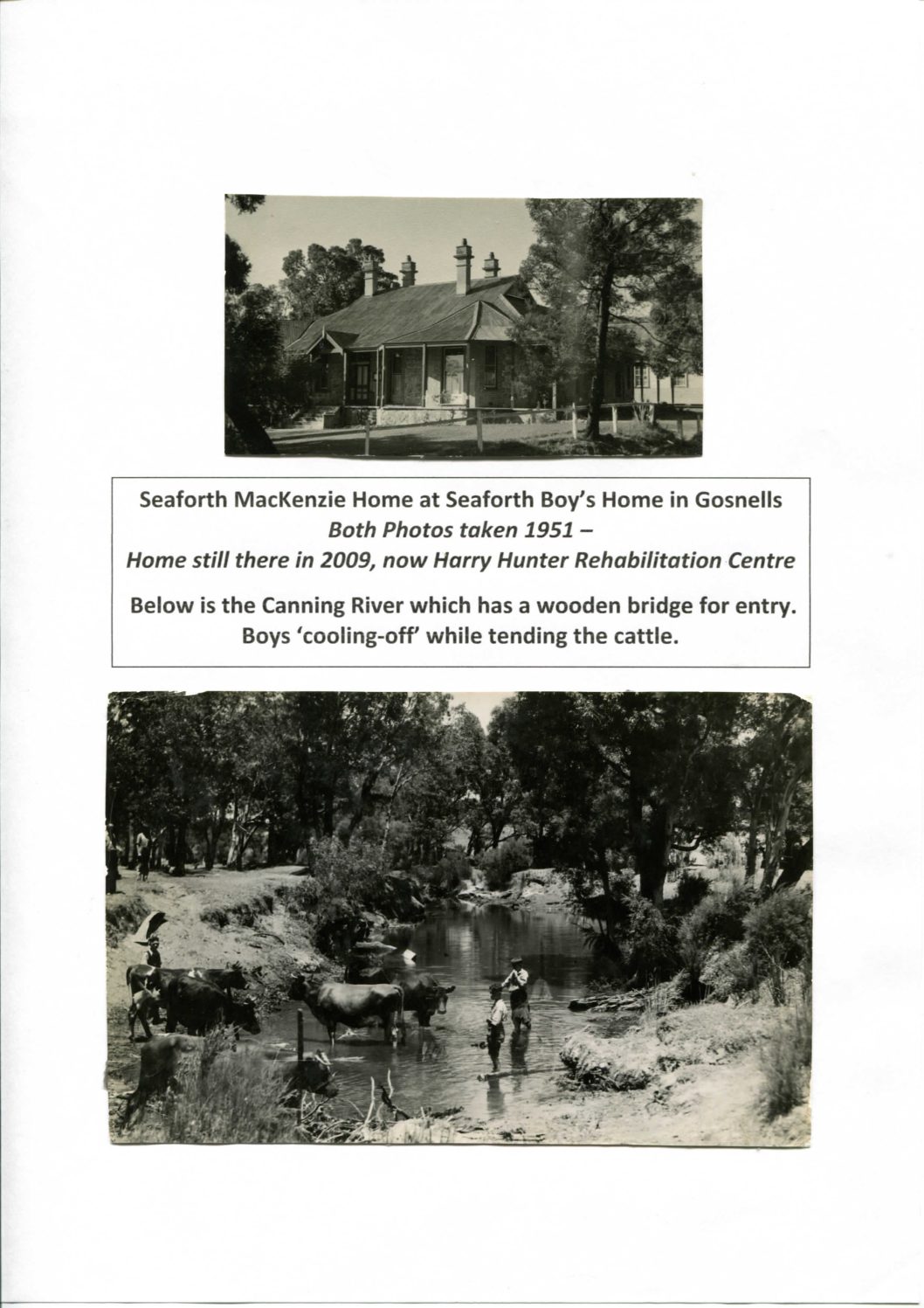Description: ‘Seaforth MacKenzie Home at Seaforth Boy’s Home, 1951’ is a digital copy of four images mounted on paper and held in the Seaforth photos file at the Salvation Army Heritage Museum WA. A typed caption identifies the images as a photograph of the homestead used for the Seaforth Boys’ Home; a photograph of boys in the Canning River, tending cattle in 1951; buildings, including the workshop; and Brigadier Sam McCormack with boys in the workshop. As boys from the reformatory used the workshop, it is possible that the images are relevant to both the Seaforth Boys’ Home and the Seaforth Salvation Army Boys’ Reformatory.
