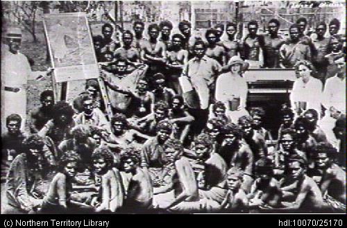Description: This image is also available in the State Library of New South Wales Library. The description in from the State Library of NSW states: First service held at Goulburn Island, Arnhem Land, 1916. Image shows 4 missionaries giving a service to Indigenous Australians on Jesus walking on the sea.