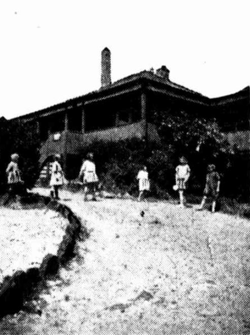 Description: This is a black and whtie image of Shuna Red Cross Home, Leura. It shows six girls standing on the path in the leading up to Shuna, and the house behind them. It was published in The Sun on 6 March 1927, along with other photos of the Shuna and Juong Red Cross Homes in the Blue Mountains.