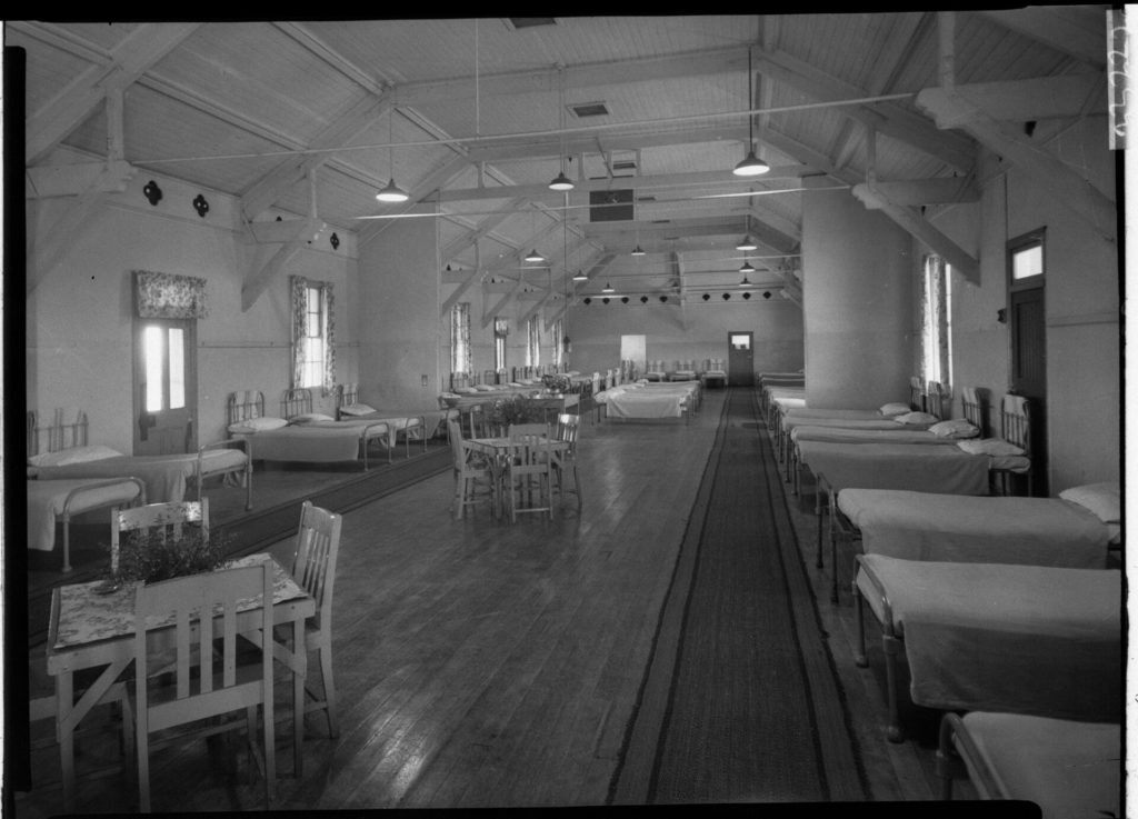 Description: This is a photograph of the dormitory in the “priveleged block” at Mount Penang Training School. It shows a long hall with metal framed beds against the walls, with more beds and small tables and chairs in the centre of the room. There is no other furniture or decorations in the room.