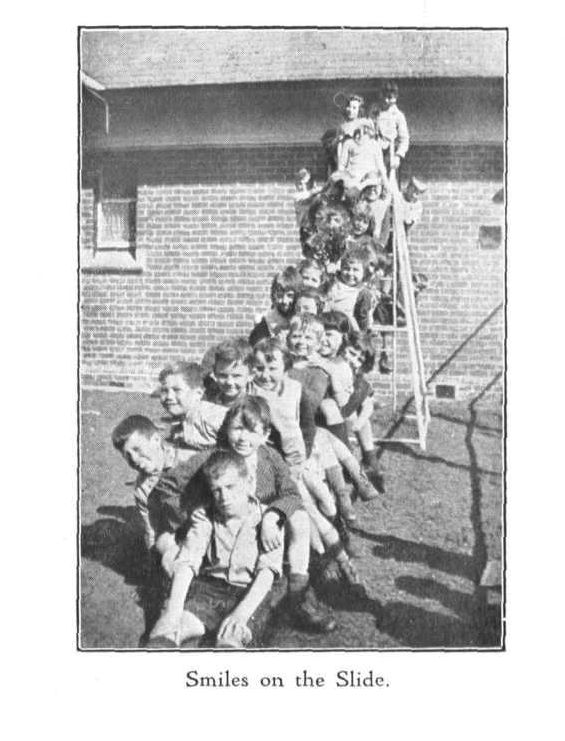 Description: This is an image of Methodist Homes for Children published in the pamphlet, Furnishings of love (1938). The caption reads: ‘Smiles on the Slide’.