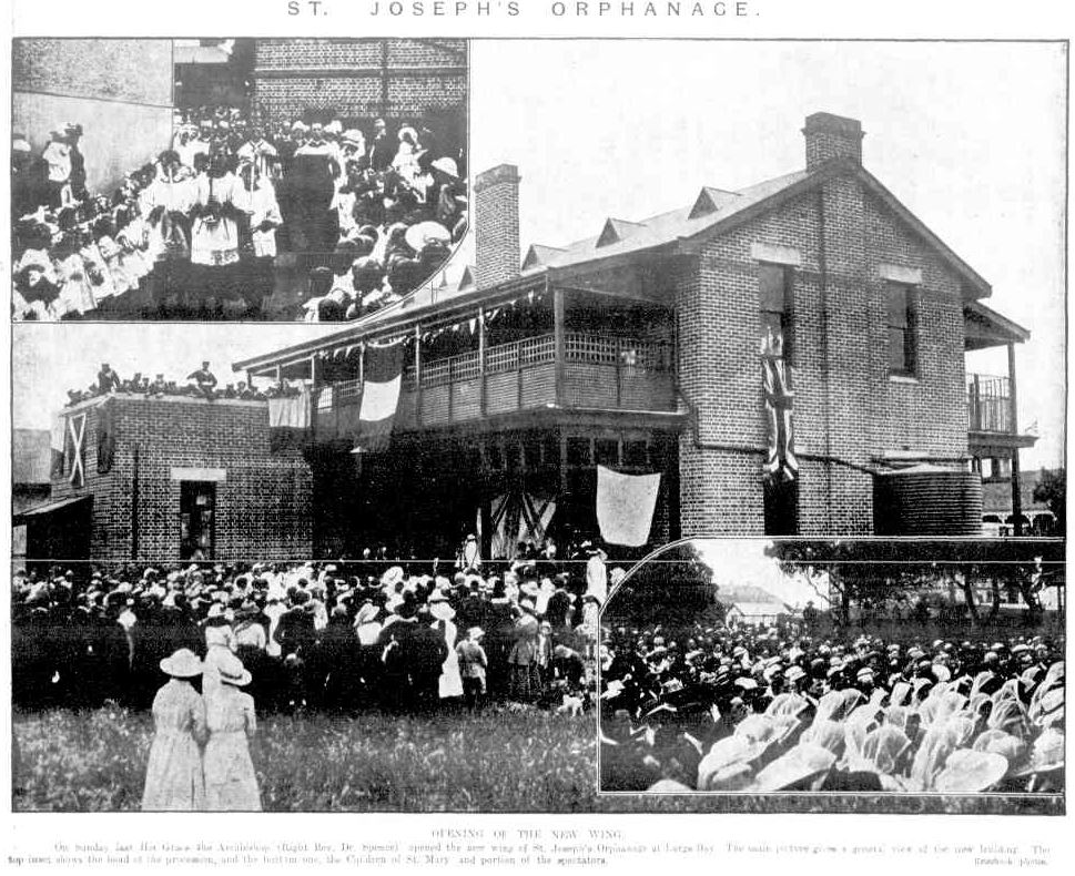 “On Sunday last His Grace the Archbishop (Right Rev. Dr. Spence) opened the new wing of St. Joseph’s Orphanage at large Bay. The man picture gives a general, view of the new building. The top inset shows the head of the procession, and the bottom one, the Children of St. Mary and portion of the spectators.”